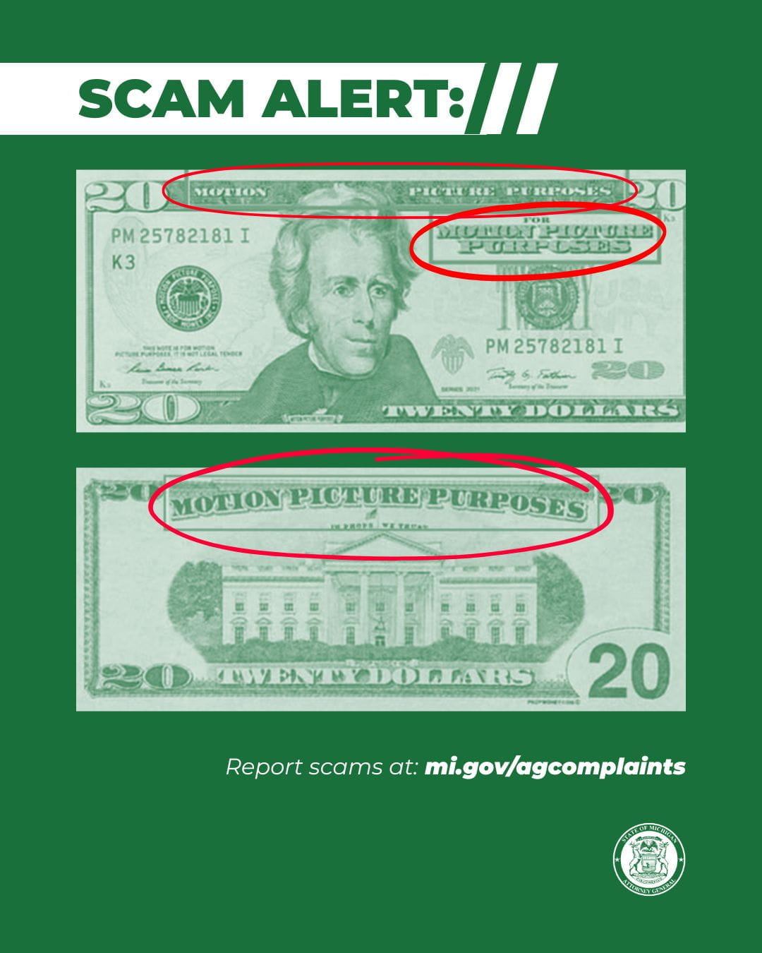 LANSING – Michigan Attorney General Dana Nessel is reissuing her consumer alert on recognizing scams after numerous social media reports surfaced of Michigan residents being paid with realistic “prop money” marked as “For Motion Picture Purposes” (JPG) for items sold on Facebook Marketplace and similar platforms.
