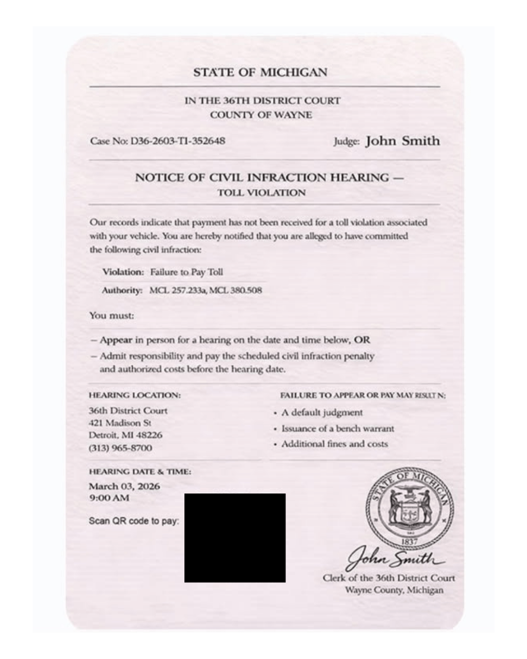 LANSING – As part of National Consumer Protection Week, Michigan Attorney General Dana Nessel is reissuing her consumer alerts on smishing scams and government imposter scams due to a new version of a toll road scam targeting residents. This latest scam involves a fraudulent text with an image (PNG) claiming to be a “Notice of Civil Infraction Hearing” regarding a toll violation from the 36th District Court in Wayne County. The message falsely warns that the recipient must appear in person for a hearing or admit responsibility and pay a penalty before the scheduled hearing date.
