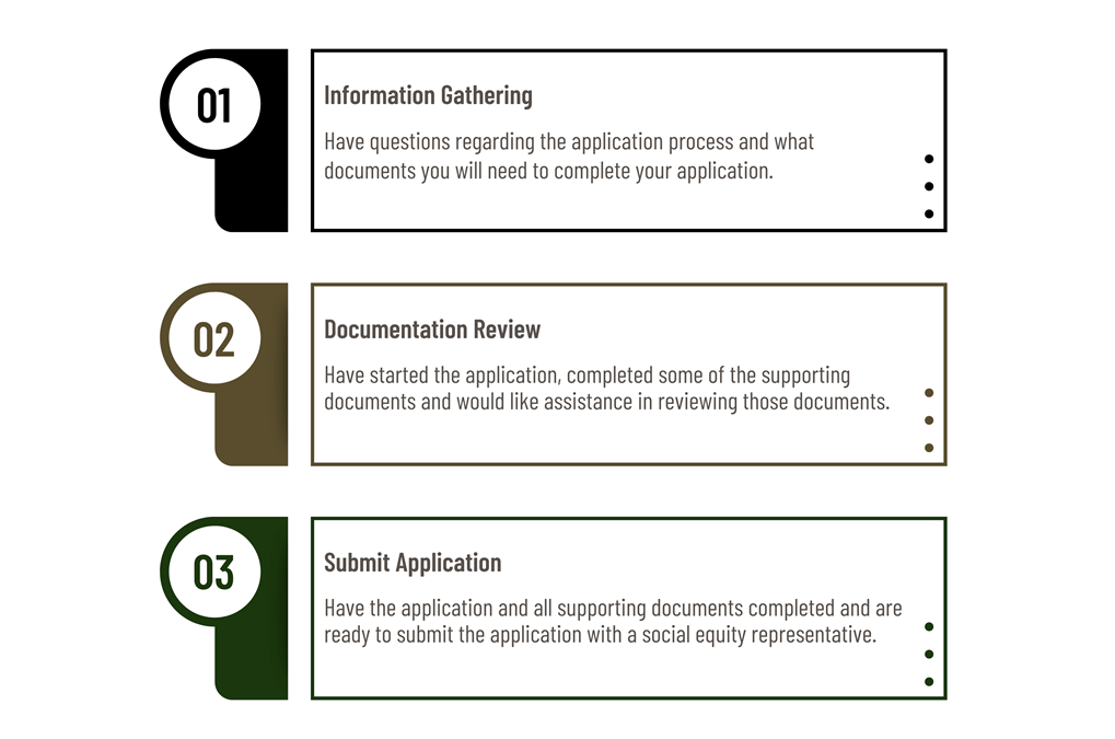 Appointments will be conducted by a phone or video call with a social equity representative. Prior to requesting an adult-use application assistance appointment, eligible social equity participants should determine the level – level 1, level 2, level 3 – they are at within the application process by using the table below.