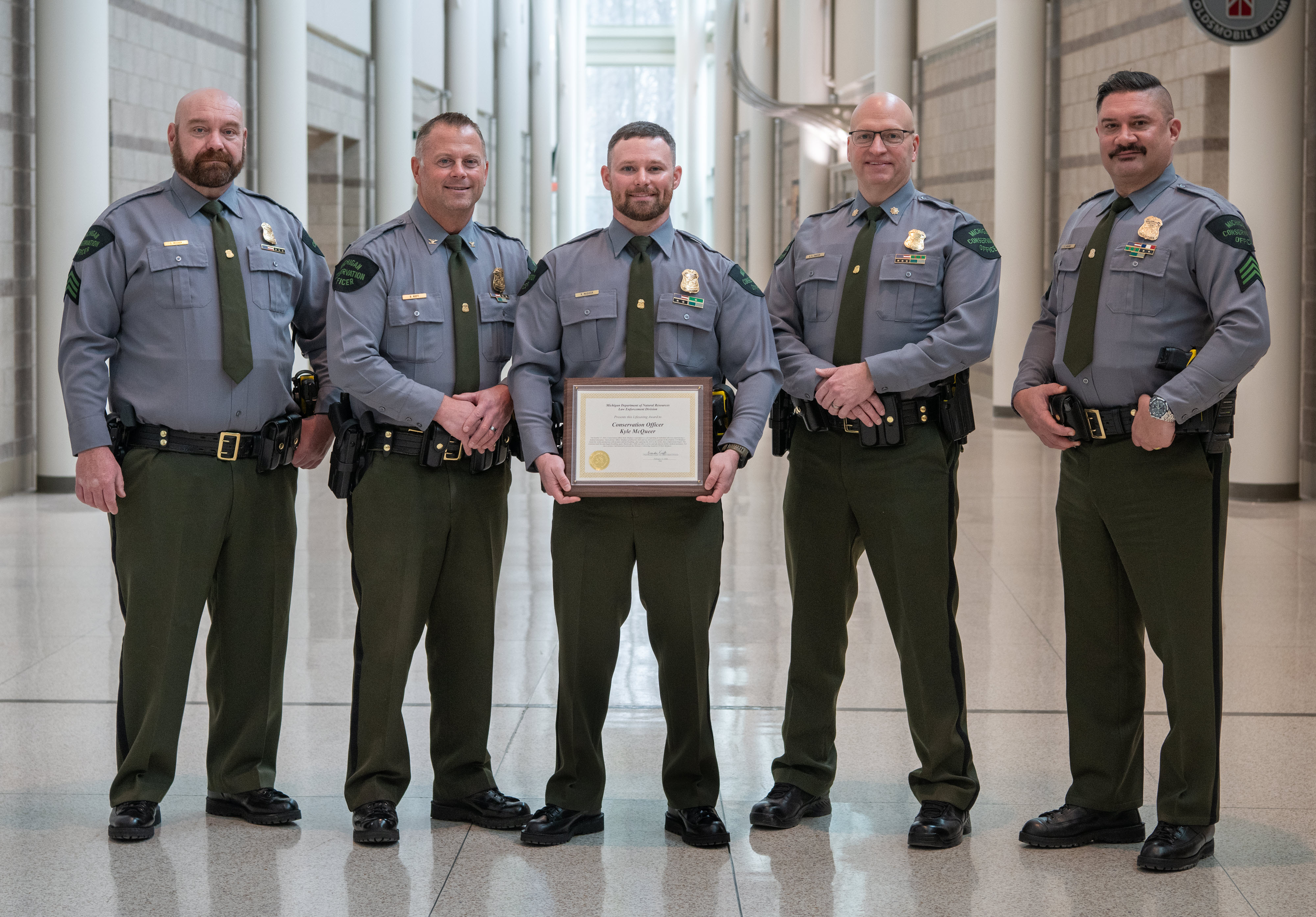 McQueer: Michigan DNR Conservation Officer Kyle McQueer was presented with a Lifesaving Award at the February meeting of the Michigan Natural Resources Commission in Lansing. In October 2024, McQueer was the first emergency responder to arrive on scene and provide lifesaving care to a man who was experiencing cardiac arrest. McQueer is pictured with leadership from the DNR Law Enforcement Division, including (left to right) Acting 1st Lt. Stephen Mooney, Chief Brandon Kieft, McQueer, Acting Asst. Chief Gerald Thayer and Sgt. Chris Holmes.