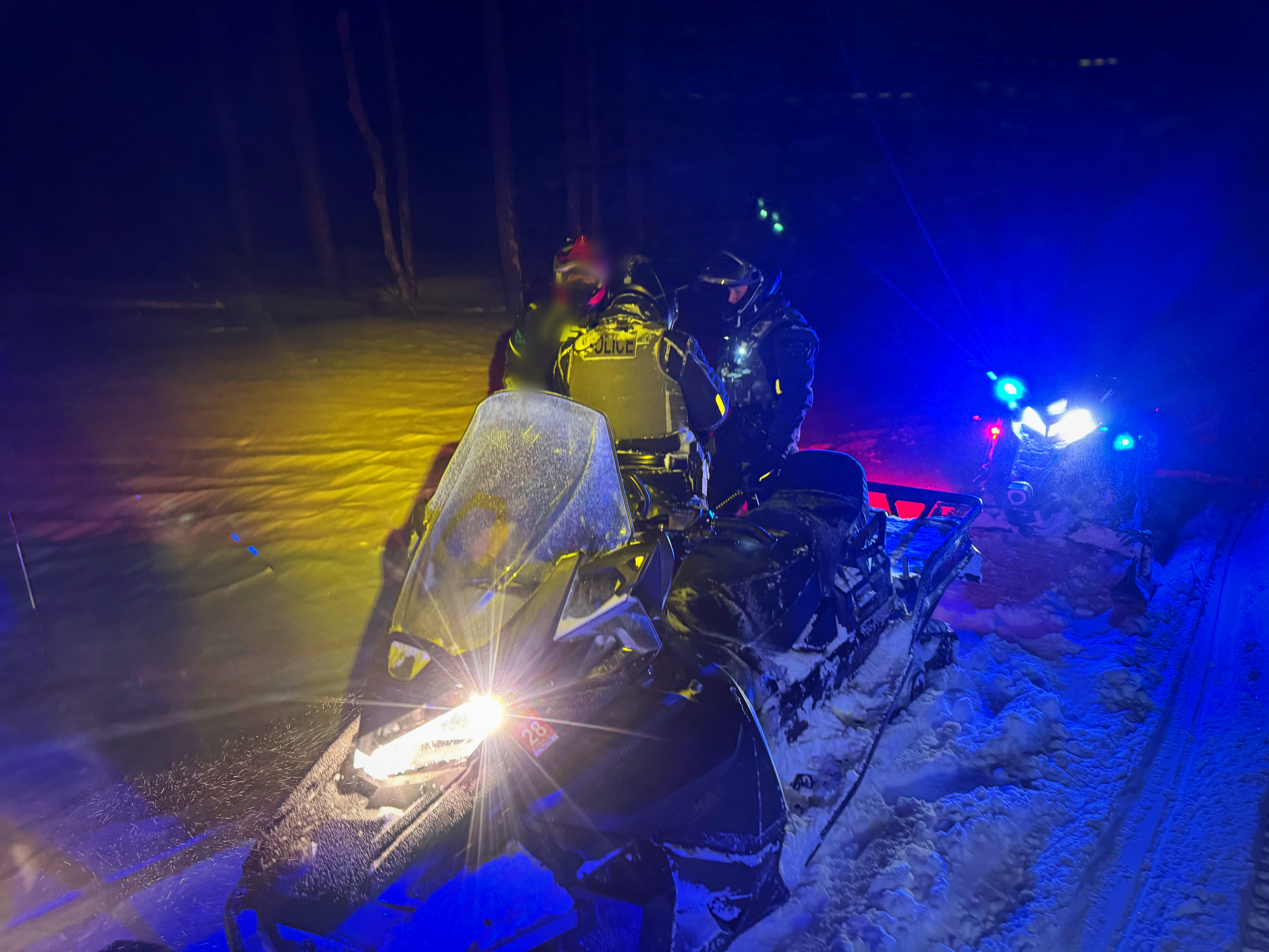 Conservation officers Cpl. Cole VanOosten and Justin Vinson responded on their snowmobiles, from their residences, with roads drifted, snow-choked and impassable by motor vehicle.