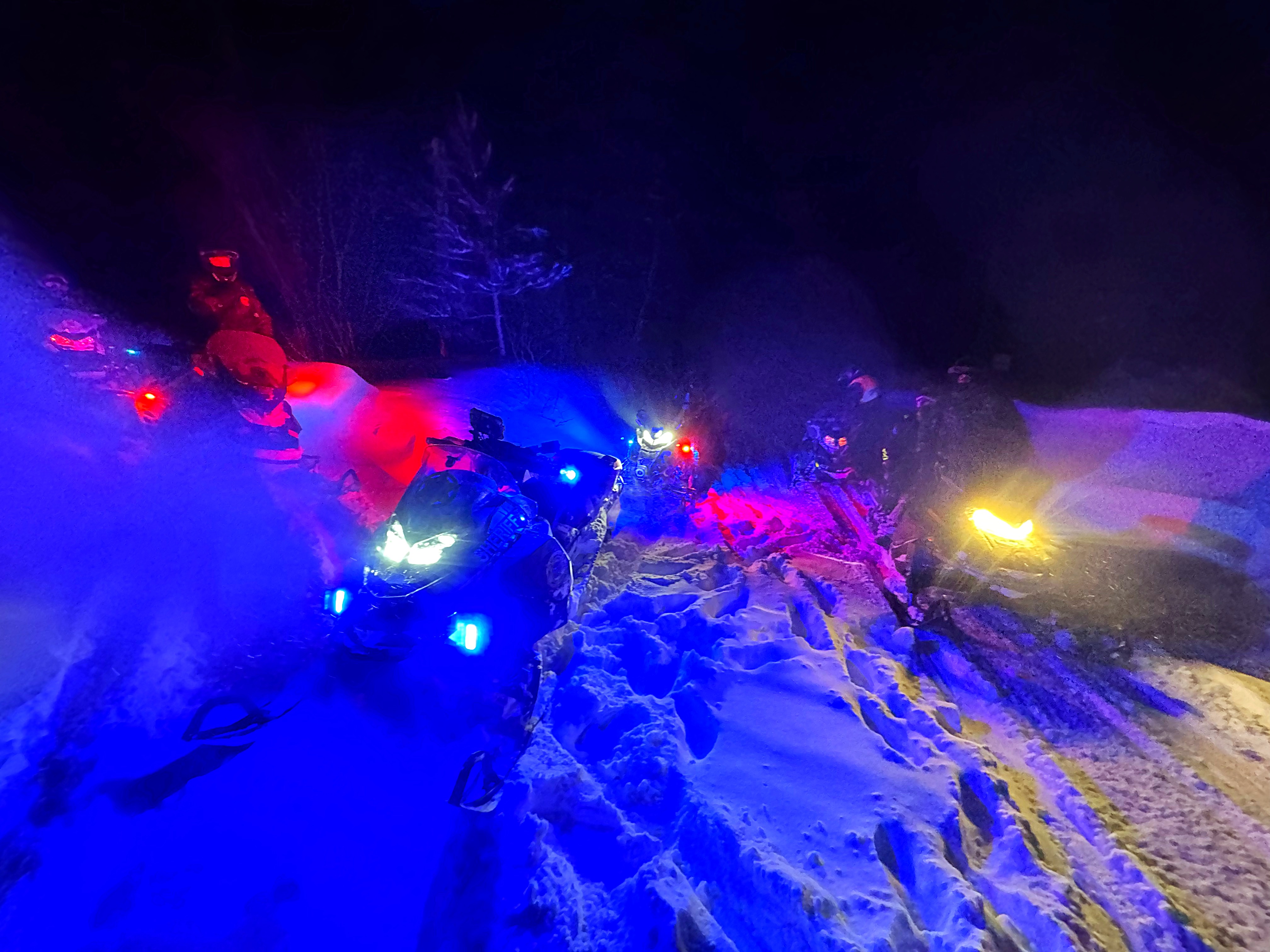 The six officers then headed their snowmobiles toward the callers’ last known location. They encountered significant road blockages caused by drifting snow and other debris, including tree branches.