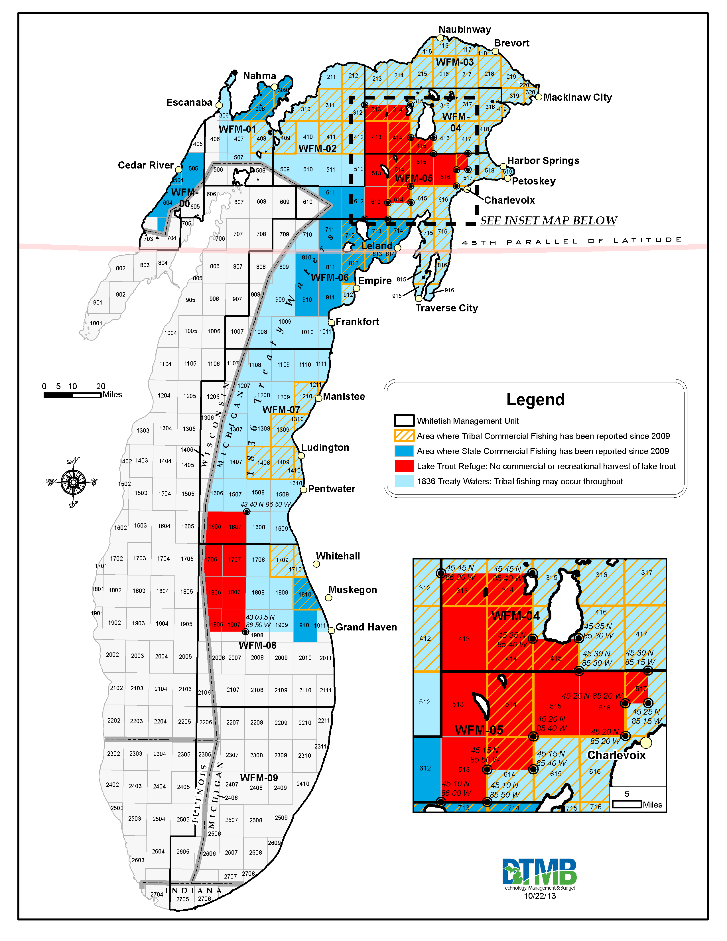 Maps include: lake trout refuges, tribal commercial fishing zones, trap net locations and recent state-licensed commercial fishing areas.