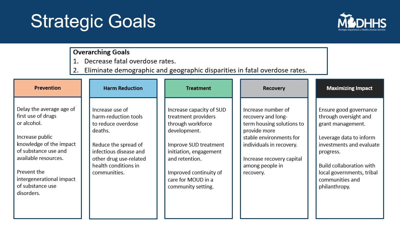 Michigan’s opioid crisis response focuses on prevention, treatment, and harm reduction. A summary of specific programs supported is available here.