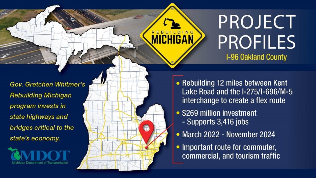 The I-96 Flex Route from Kent Lake Road to the I-275/I-696/M-5 interchange will consist of intermittent shoulder use and ramp metering at eight ramps within the project limits. The system will post variable speed advisories and traveler information using electronic message boards. The median shoulders will be rebuilt to be used as an additional lane during peak travel periods, special events, maintenance activities, and incidents/crashes.