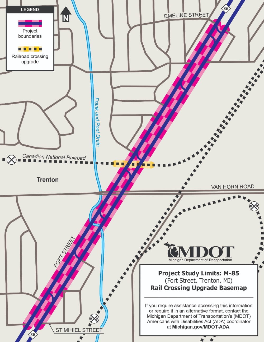 This study will involve an engineering study and an environmental review to explore different ways to improve the M-85 (Fort Street) and Canadian National (CN) (GTW) railroad at-grade crossing, just north of Van Horn Road in Trenton, Wayne County.