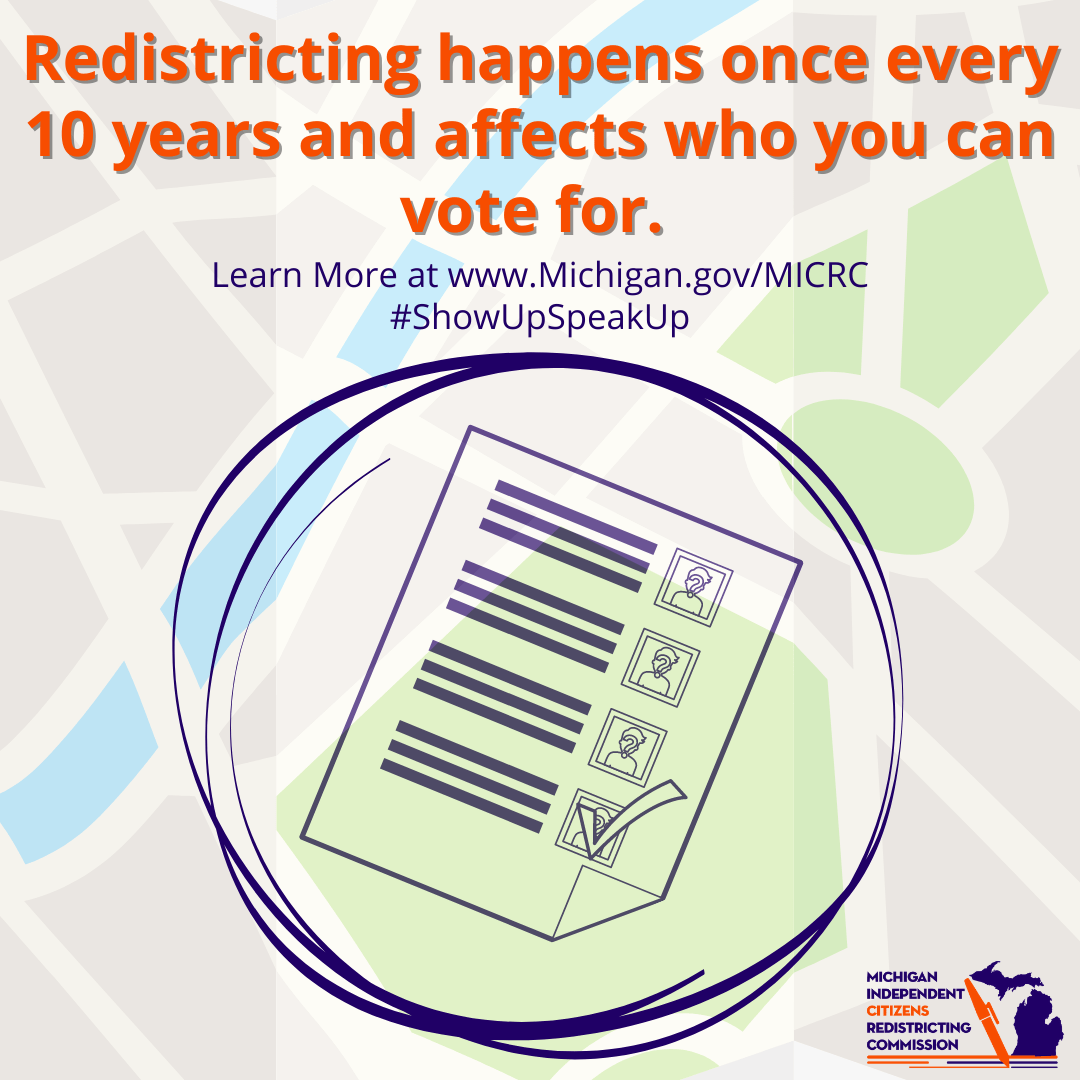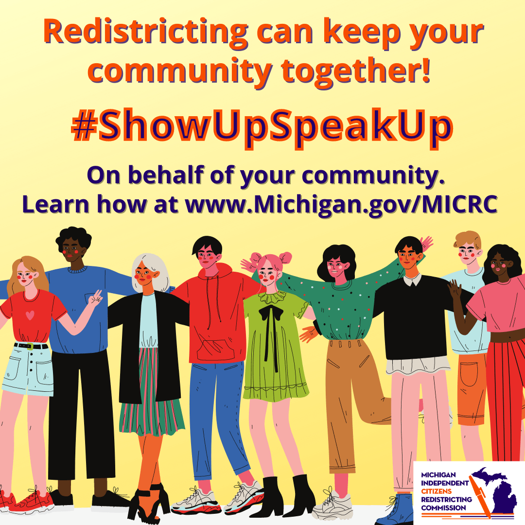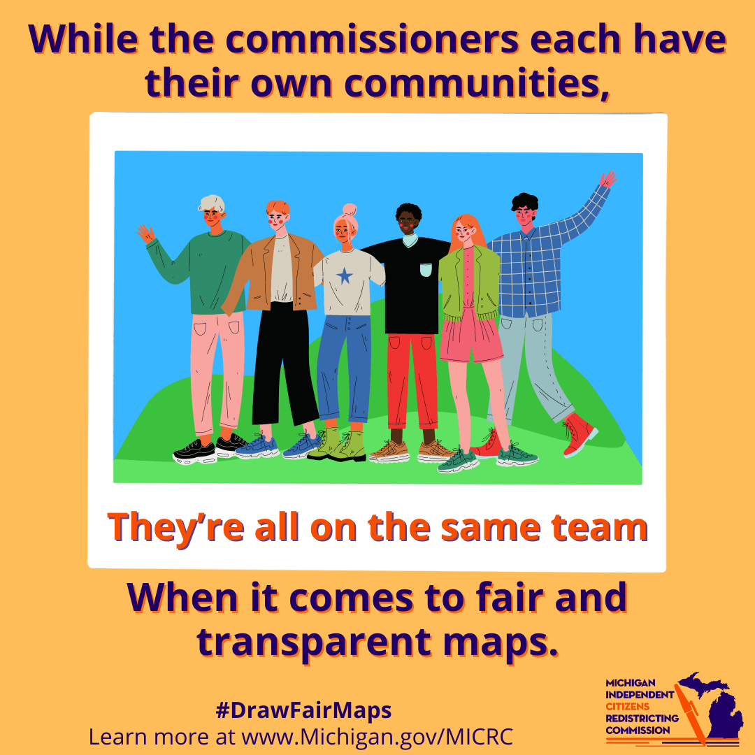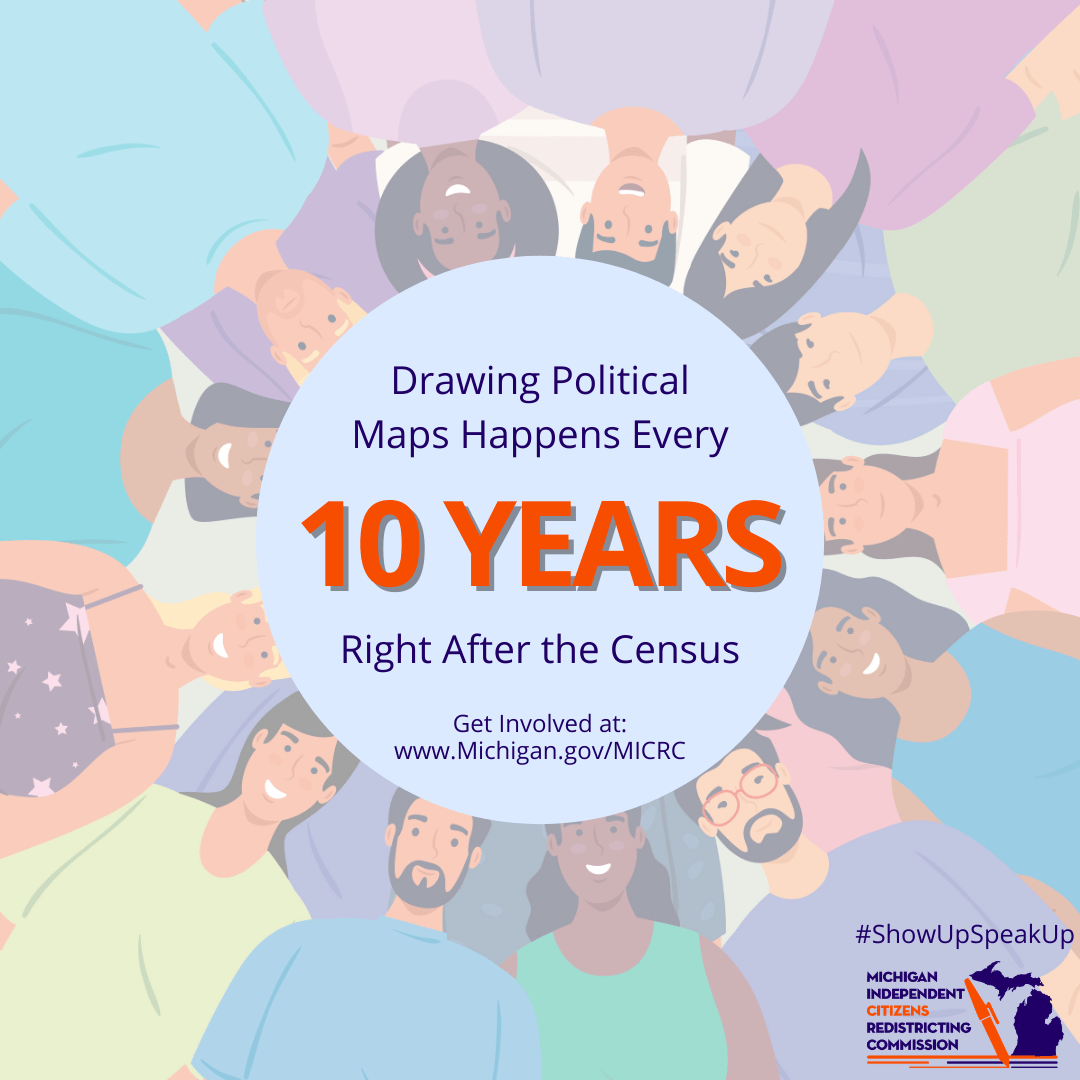 On this page you will find links to graphics produced by the Michigan Independent Redistricting Commission for use by the Commission and the public to publicize the work the Commission did at the time they were active.