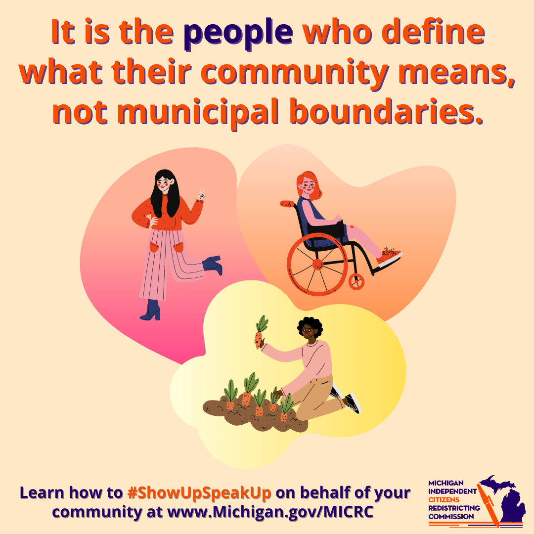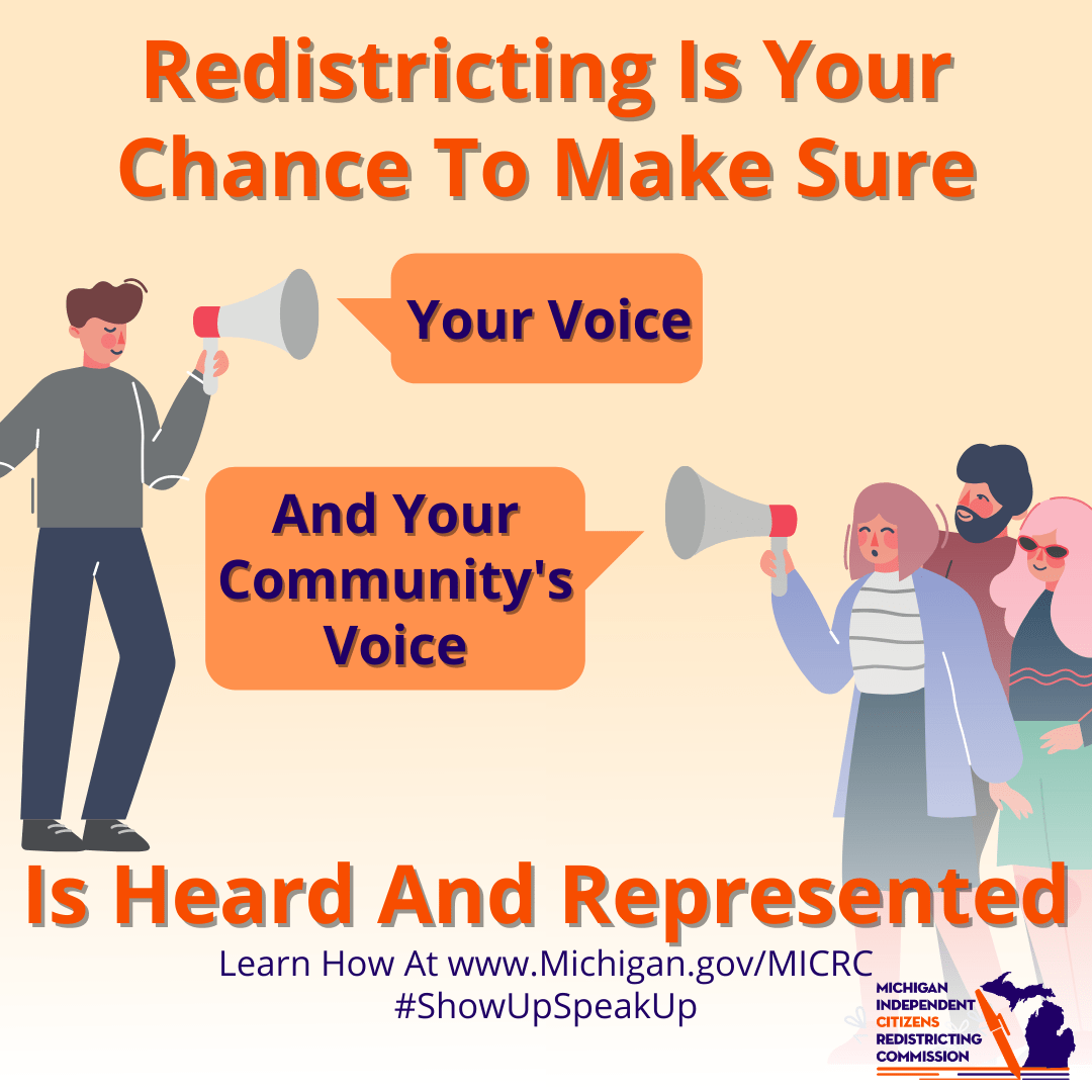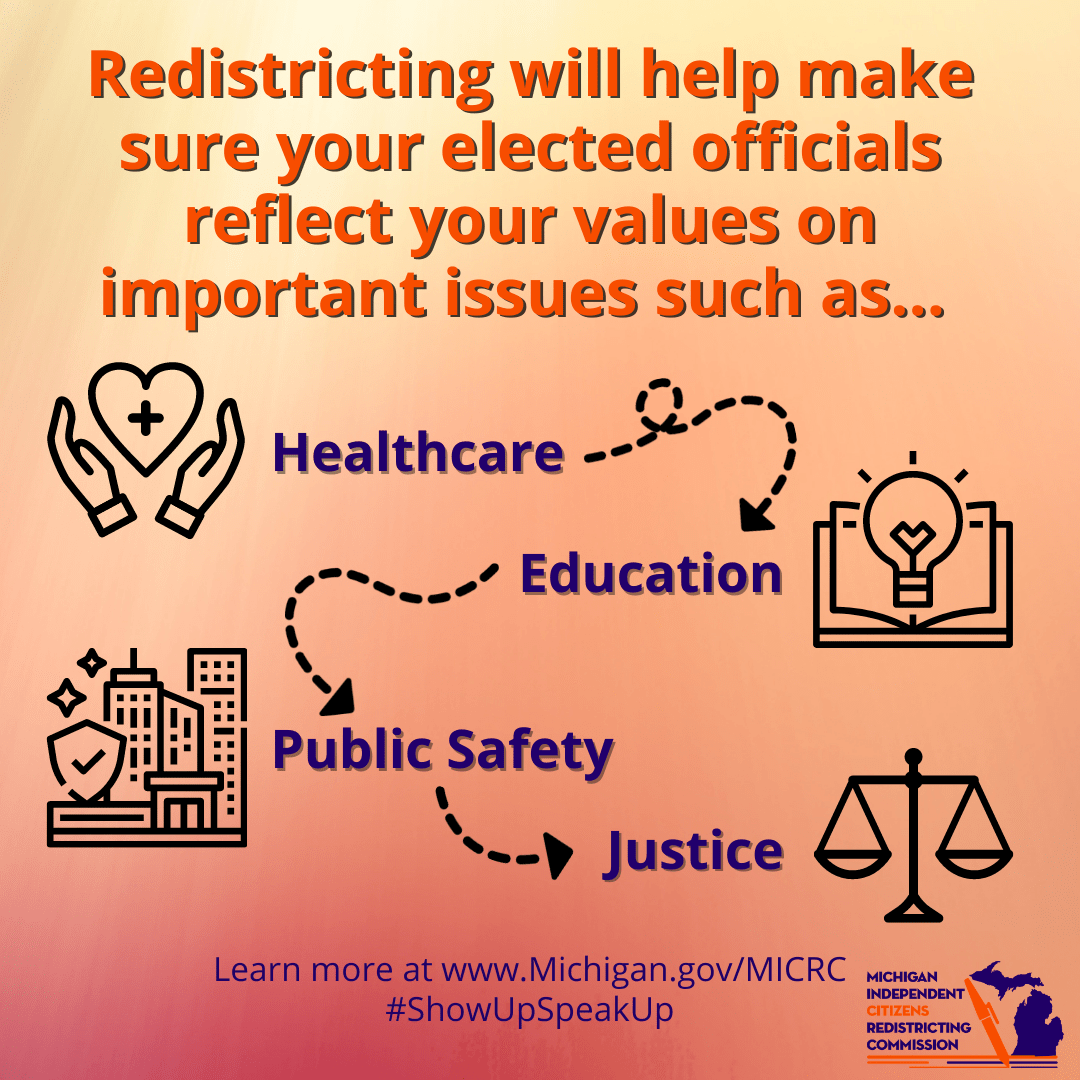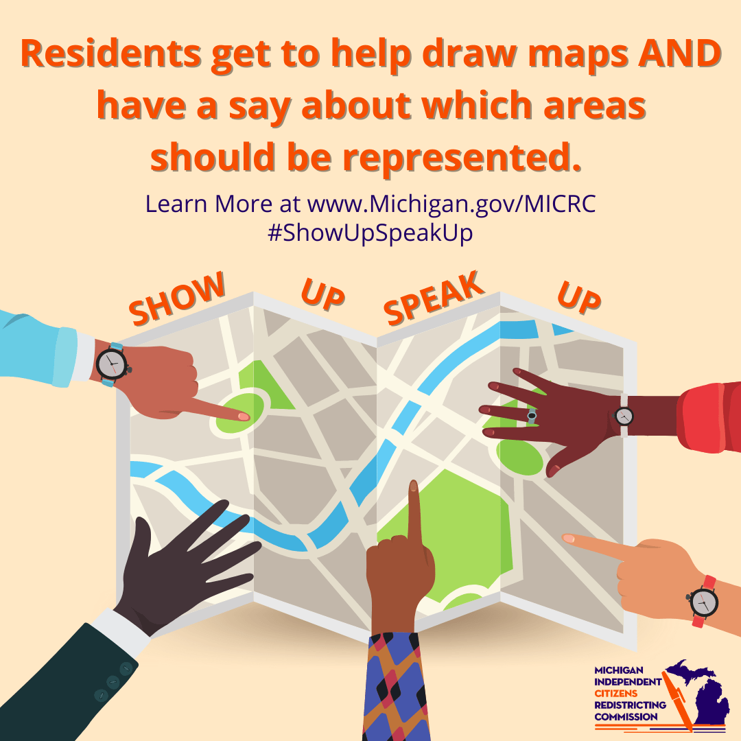 On this page you will find links to graphics produced by the Michigan Independent Redistricting Commission for use by the Commission and the public to publicize the work the Commission did at the time they were active.
