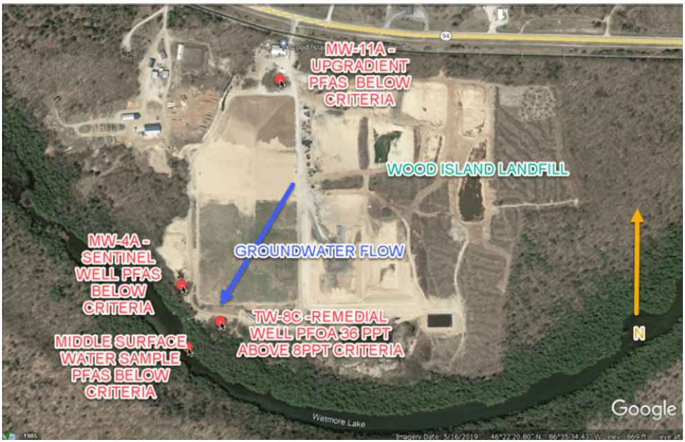- On January 28, 2022, EGLE received the PFAS sampling results from the landfill. Samples were collected from select monitoring wells, the on-site groundwater treatment system, landfill leachate, and Wetmore Lake. One monitoring well located downgradient of the landfill had PFOA at 36 ppt compared to criteria of 8 ppt.