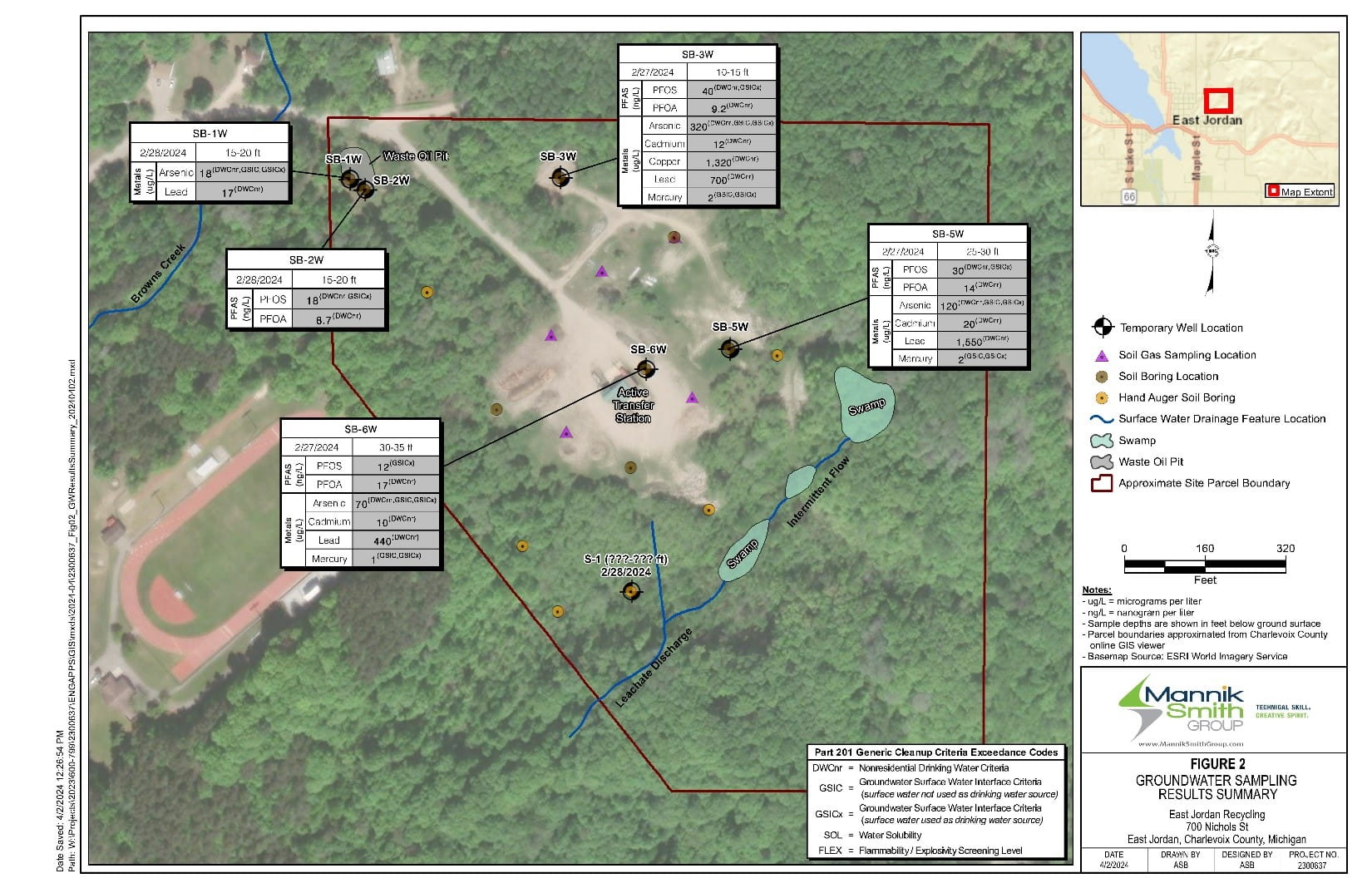 East Jordan Disposal, located at 700 Nichols Street, is a closed municipal landfill/transfer station that served the city of East Jordan. For over 20 years, a clay-lined oil storage pit at the entrance to the landfill was used for firefighter training in extinguishing oil fires. In 1980, contaminated soils from the oil pit were excavated. In February of 2024, during an EGLE Brownfield Site Assessment grant, groundwater monitoring wells around the former landfill were sampled. The highest PFAS detection was 40 ppt PFOS (compared to 16 ppt Drinking Water Criteria and 12 ppt Water Quality Value) and 17 ppt PFOA (compared to 8 ppt Drinking Water Criteria).