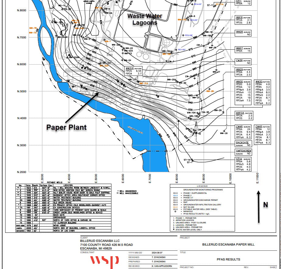Billerud Escanaba Area of Interest, located at 7100 County Road 426, has operated as a paper making facility since circa 1911. Over the history, the site has been owned by several different paper companies with the latest being Billerud Americas Corporation. In October of 2023, EGLE had their contractor (AECOM) collect groundwater samples from seven monitoring wells to evaluate for PFAS, iron, manganese, arsenic, ammonium, and nitrate. Two monitoring wells located on the southeastern portion of the property had detections of PFOA above criteria of 8 ppt. Additional PFAS compounds were detected in the groundwater but were below criteria. Based on record review of historical and current operations no PFAS is known to be used at this site, and it is unclear what the source of the PFAS is in the groundwater. The highest groundwater PFAS results were located near the southern boundary of the plant property, with the monitoring wells in the center of the plant property having only minor detections of PFAS compounds.