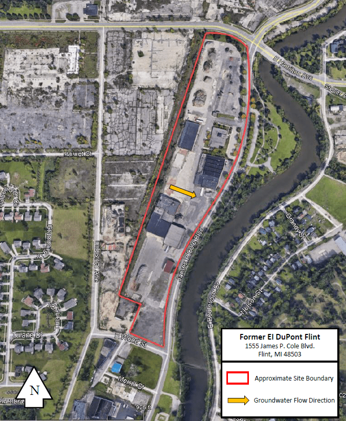 The Former EI DuPont Flint (DuPont), located at 1555 James P. Cole Boulevard, was formerly owned by EI DuPont De Nemours, and was primarily used for automotive paint and varnish manufacturing from 1901 to 1995. Cleanup of contamination from former facility operations, mainly consisting of petroleum constituents and fuel oil, has been ongoing since the early 2000s. DuPont, now a subsidiary of Corteva Agriscience, remains responsible for remedial actions at the site. EGLE requested PFAS sampling in 2018 because of former product manufacturing.