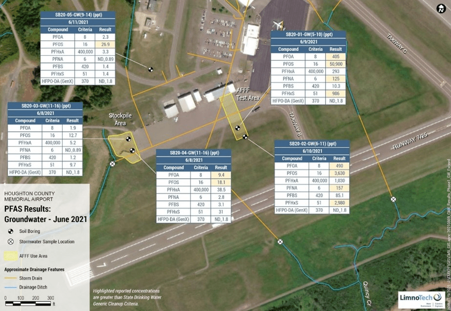 Houghton County Memorial Airport is located at 23810 Airpark Boulevard.On September 8, 2020, the Airport was awarded a grant to investigate potential PFAS contamination associated with Aqueous Film Forming Foam (AFFF).The first phase of the investigation conducted by LimnoTech, the consultant for the Airport, focused on two areas where AFFF was known to have been used by the airport for fire suppression equipment testing, and included collecting soil, groundwater, and surface water samples.