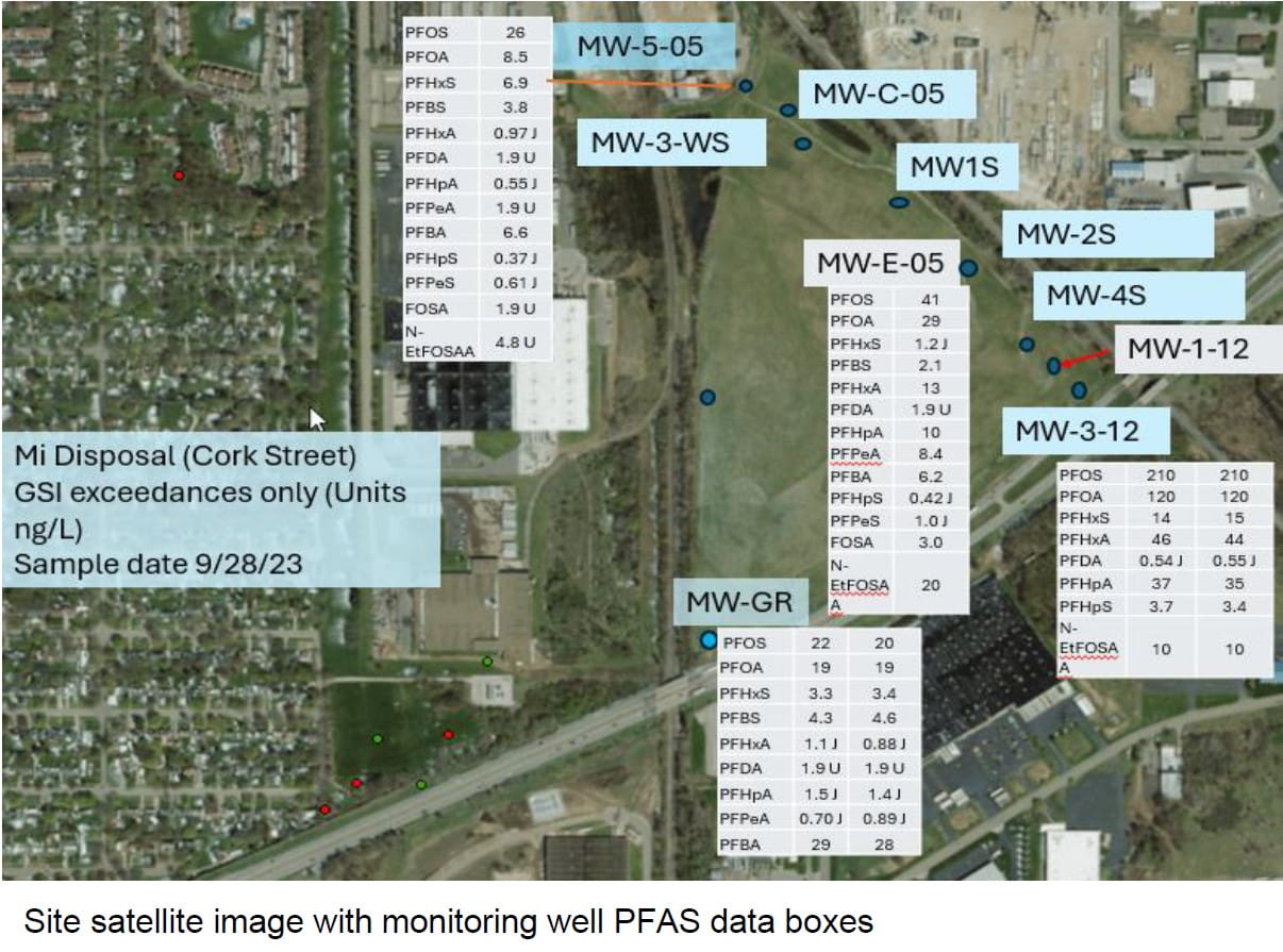 In April 2018, as part of EGLE’s Industrial Pretreatment Program, the city of Kalamazoo Wastewater Treatment Plant (WWTP) tested leachate coming from the Landfill for PFAS. The results exceeded cleanup criteria, causing EGLE to request the EPA to conduct groundwater sampling for PFAS. The highest groundwater result was 210 ppt PFOS (compared to 16 ppt). Shallow groundwater and leachate flows from west to east and discharges into Davis Creek.