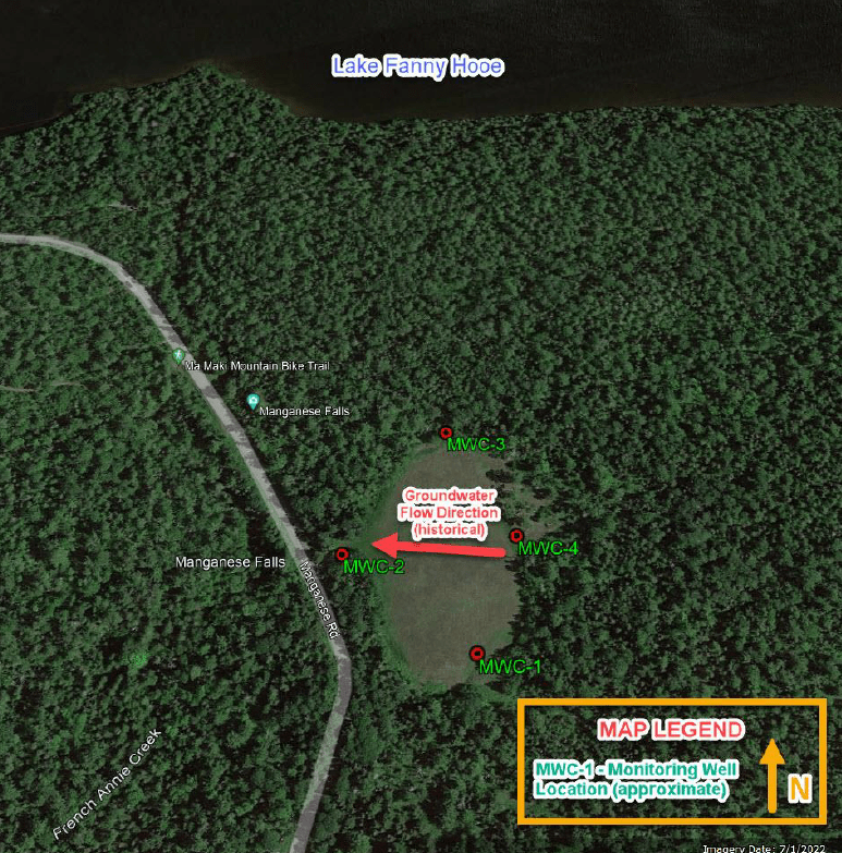 Nearby water bodies include: Lake Fanny Hooe, which is located approximately 1,000 feet north of the landfill; and French Annie Creek and Manganese Falls, which are located approximately 350 feet northwest of the landfill. French Annie Creek flows in a northerly direction, and ultimately discharges into Lake Fanny Hooe.