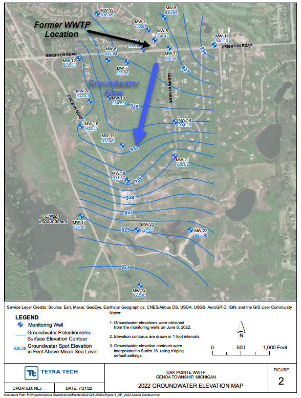 The groundwater flow is to the south/southwest. Chilson Impoundment and Chilson Creek are downgradient, however sampling of the former WWTP monitoring well network has shown that the PFAS plume does not reach the impoundment and/or creek.