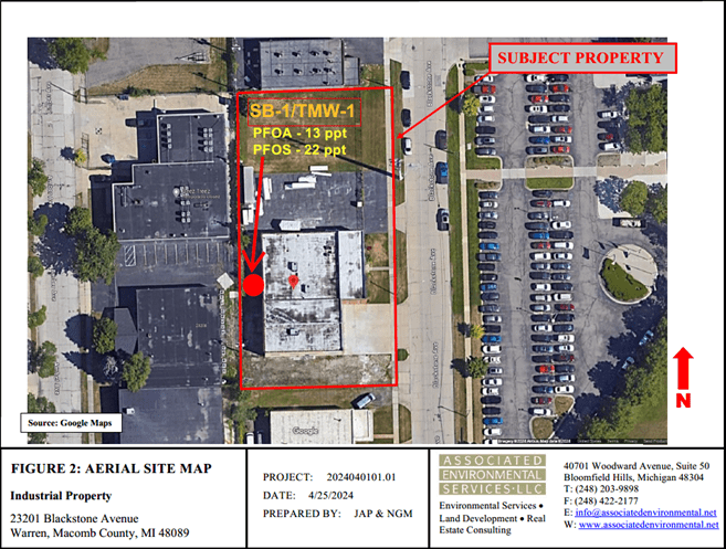 23201 Blackstone Avenue is a 0.76-acre site that was used for metal working and tool and die manufacturing from 1962 through 2017. Five temporary monitoring wells were sampled in July 2024, and results were included in a Baseline Environmental Assessment (BEA) that EGLE received in March 2025. BEAs are used by potential land purchasers to establish liability protection for existing contamination when they buy or start to operate a site. The highest results were 13 ppt PFOA (compared to 8 ppt) and 22 ppt PFOS (compared to 16 ppt). Groundwater flows to the south/southeast towards Lake St. Clair. The nearest water body is Bear Creek, 3.3 miles to the northwest.