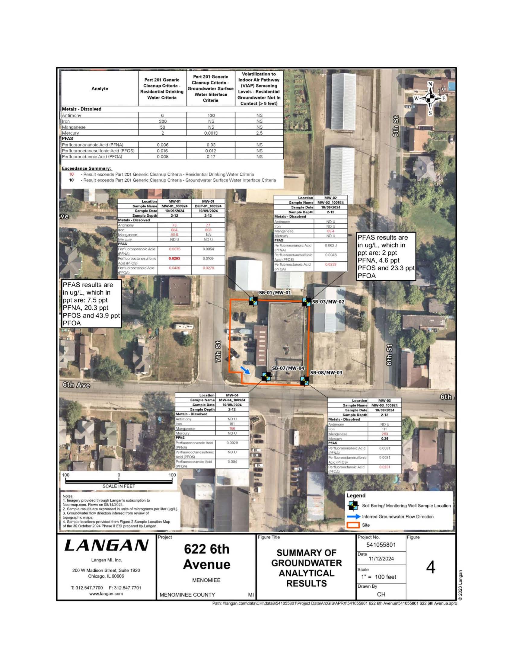 The 0.54-acre parcel located at 622 6th Avenue was historically the site of railroad operations, a fruit and vegetable wholesaler, a paper company, a broom manufacturer and, since 2000, Menominee Saw and Supply. EGLE became aware of groundwater contamination at this site due to a baseline environmental assessment (BEA), which allows a person to buy or operate at a site without being held liable for existing contamination. The BEA included results from four groundwater samples. All four wells exceeded criteria, the highest of which was 20.3 ppt PFOS (compared to 16 ppt), 43.9 ppt PFOA (compared to 8 ppt) and 7.5 ppt PFNA (compared to 6 ppt). Presumed groundwater flow is to the south/southeast. The nearest surface water body is the Menominee River located approximately 0.35 miles to the south and Lake Michigan located approximately 0.4 miles to the east.