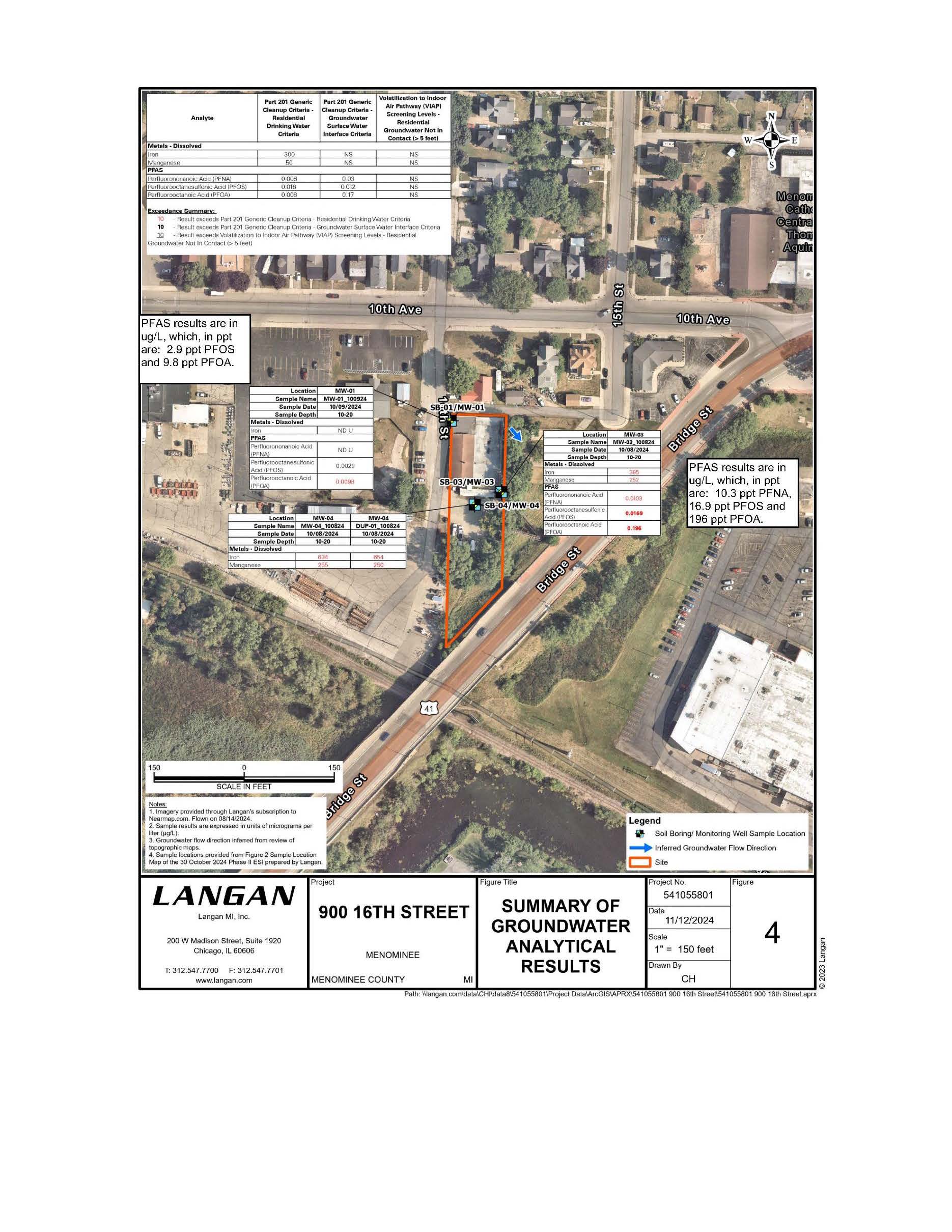 This property is located on a 0.69-acre parcel at 900 16th Street. The site was first occupied by Folstad Implement Sales and Service, a dealer of International Harvester equipment, from 1941 until 1977. McGiveron Metal Shop took over operations in 1982 and Menominee Saw and Supply has occupied the property since 1987. EGLE became aware of groundwater contamination at this site due to a baseline environmental assessment (BEA), which allows a person to buy or operate at a site without being held liable for existing contamination. The BEA included results from three groundwater samples, the highest of which was 196 ppt PFOA (compared to 8 ppt), 16.9 ppt PFOS (compared to 16 ppt) and 10.3 ppt PFNA (compared to 6 ppt). Groundwater flow is presumed to be to the south/southeast. The nearest surface water body is the Menominee River, which is located approximately 425 feet to the south. Lake Michigan is 0.9 miles to the west.