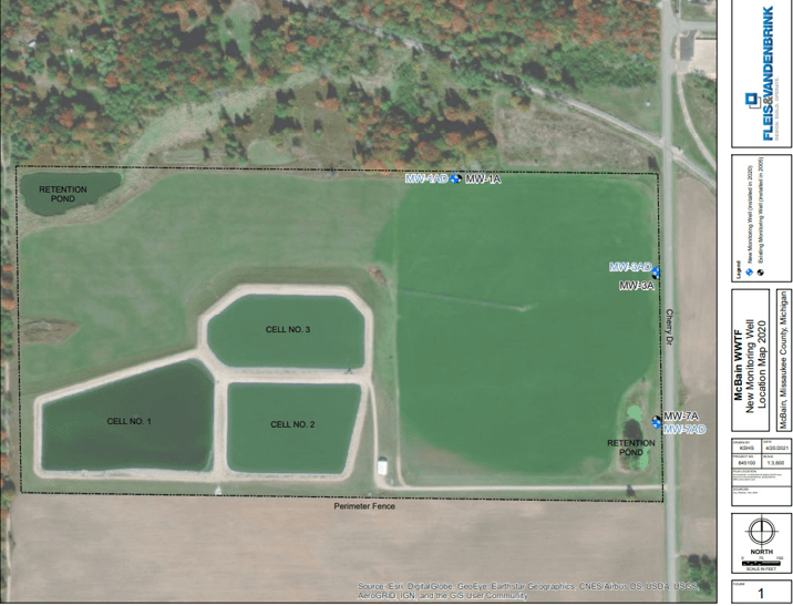 The McBain Sanitary Wastewater Treatment Plant (WWTP) is located at 261 North Cherry Street and is permitted to discharge 42,340,000 gallons of treated municipal wastewater per year. The treatment plant utilizes stabilization ponds that discharge to a spray irrigation area east of the lagoons. The treated wastewater is discharged to the ground under a state Groundwater Discharge Permit issued to the McBain Sanitary WWTP. The facility receives municipal wastewater from residential and commercial users in the city of McBain.