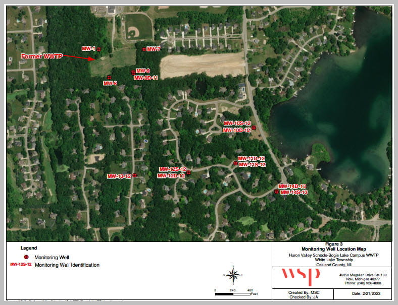 The former Huron Valley Bogie Lake Wastewater Treatment Plant (WWTP), located at 1630 Bogie Lake Road, operated under a Groundwater Discharge Permit, which was first issued on May 24, 1973. The facility was operated by the Oakland County Drain Commission and the Oakland County Water Resources Commission, both under contract with Huron Valley Schools. The groundwater discharge permit associated with the facility was terminated, the source area was removed, and the closure of the former WWTP and all the system components was completed in 2013. Since the decommissioning of the former WWTP, the site has been restored to open field green space. The former WWTP serviced an elementary school, middle school, and high school.