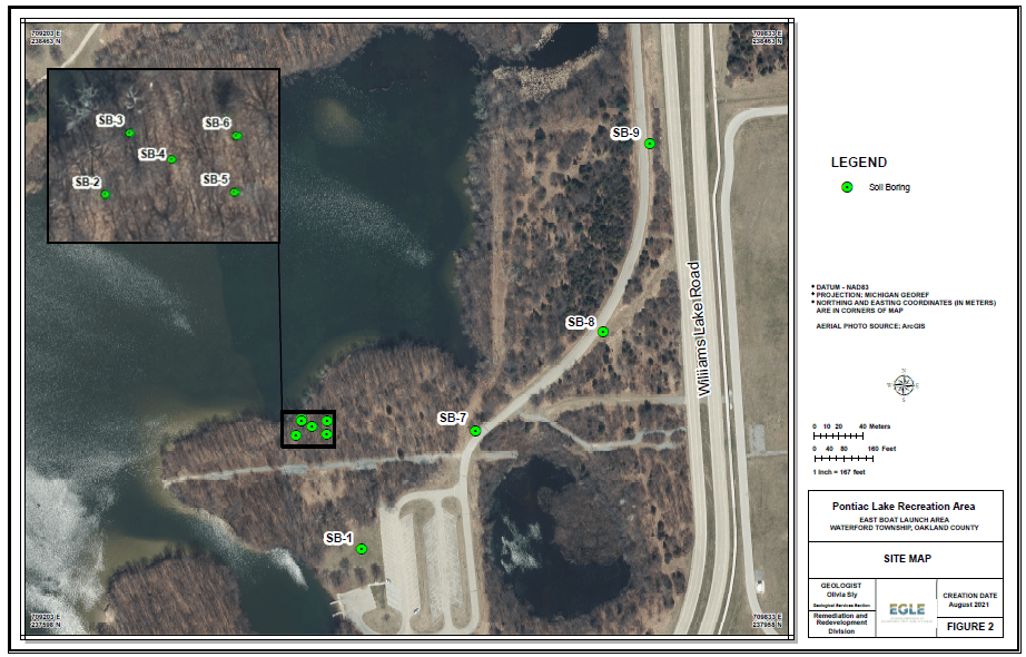 Pontiac Lake State Recreation Area operated is located at 7800 Gale Road. On January 10, 2014, a twin-engine Cessna 310 plane owned by Royal Air crashed in a wooded area at this site just north of the boat launch and south of the beach area. The plane caught fire and approximately 85 gallons of Aqueous Film Forming Foam (AFFF) was used.