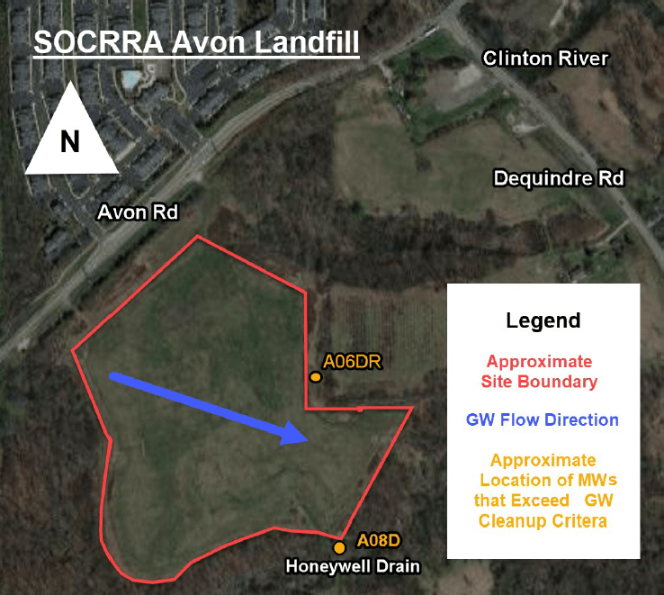 SOCRRA Avon Landfill is a 140-acre, closed sanitary landfill located at 1741 School Road. The site began receiving municipal solid waste in 1980 and was officially closed in 2005. Based on the potential for PFAS-containing materials to have been disposed at the landfill and the fact that there are potential downgradient drinking water and/or surface water receptors, the Department of Environment, Great Lakes, and Energy (EGLE) requested groundwater sampling to be conducted to determine if PFAS contamination was present at levels that would require further action.