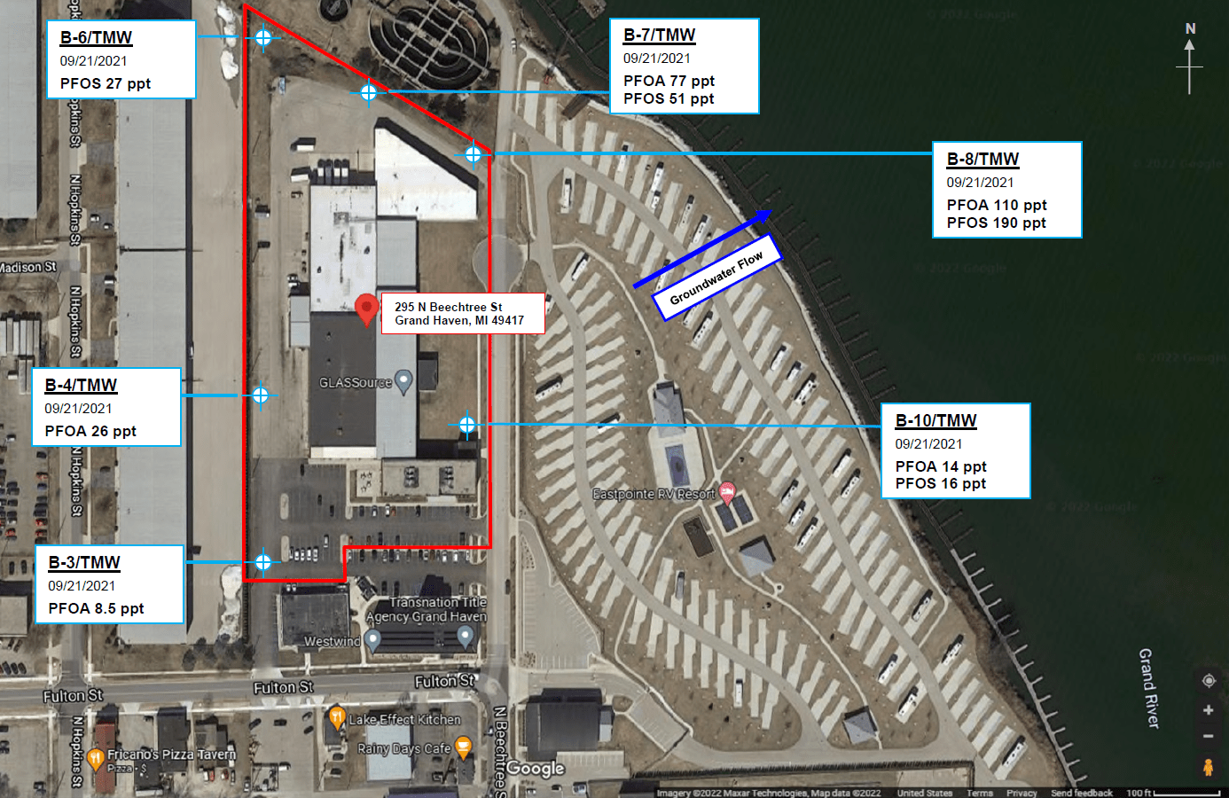 EGLE received a Baseline Environmental Assessment (BEA) in February 2022 for a portion of the old Challenge Machinery Company property, specifically 295 North Beechtree Street, Grand Haven. From 1903 to 2001 Challenge Machinery Company utilized the property to manufacture equipment and machinery for the graphic arts/printing industry. There is an extensive history of contamination at this property, and Challenge Machinery Company is the liable party. The BEA included September 2021 sampling data, which identified PFAS exceedances of groundwater clean-up criteria. Eight temporary monitoring wells were installed and sampled for groundwater. The highest concentrations of PFOA and PFOS were 110 ppt and 190 ppt, respectively.