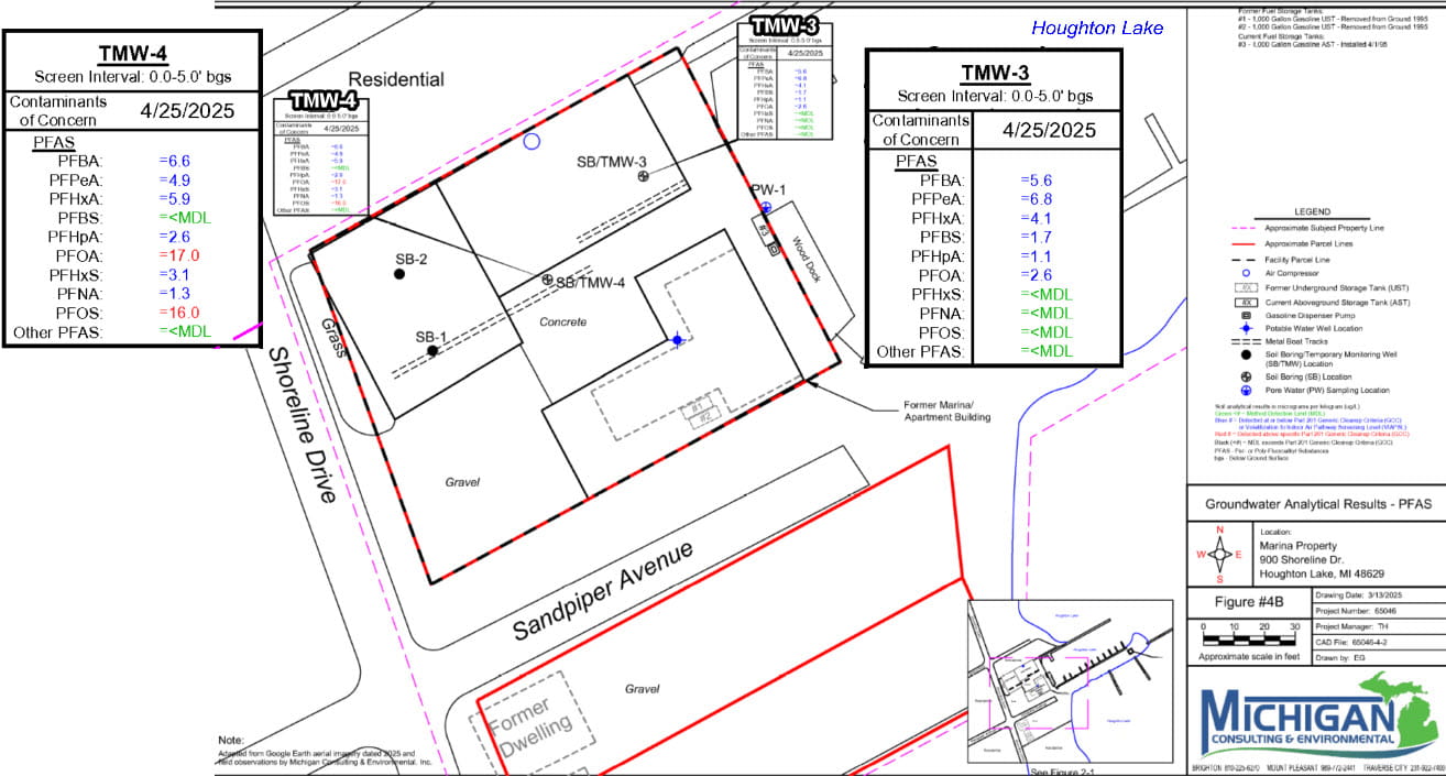 EGLE received a baseline environmental assessment (BEA) for the property at 900 Shoreline Drive, stating that temporary monitoring wells were installed at the site and had a result of PFOA at 17 ppt (compared to 8 ppt) and PFOS at 16 ppt (compared to 16 ppt). BEAs are used by potential property owners and operators to buy or operate a site without being held liable for contamination caused by previous owners and operators. The site is currently a marina and was historically used for boat manufacturing. In 2003, a fire destroyed part of the property.