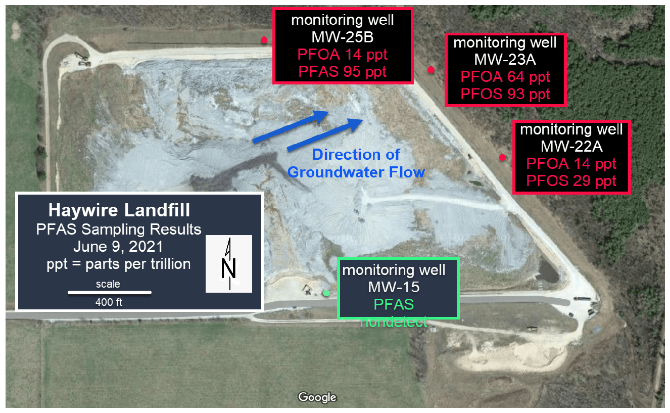 - On June 9, 2021, the Haywire Landfill consultant, Bittner Engineering, Inc., collected groundwater samples from four monitoring wells.
