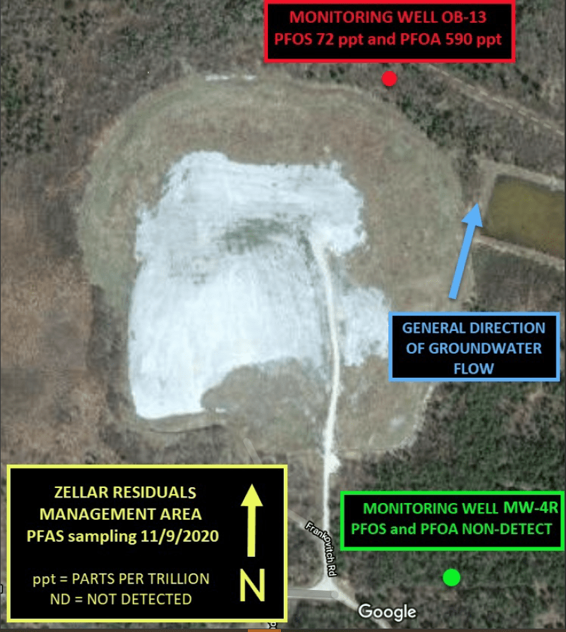 Zellar Residuals Management Area is a closed landfill that was not licensed; it operated in the 1980s to the late 1990s. The landfill received paper pulp waste from Manistique Papers, Inc. (now U.P. Paper, LLC), which processed recycled paper. The landfill was not capped when it was closed. Paper pulp waste from this era often contained PFAS chemicals. EGLE requested PFAS sampling of the Residuals Management Area because pulp waste is often high in PFAS chemicals, and the landfill is unlined and has had historical impacts to groundwater.