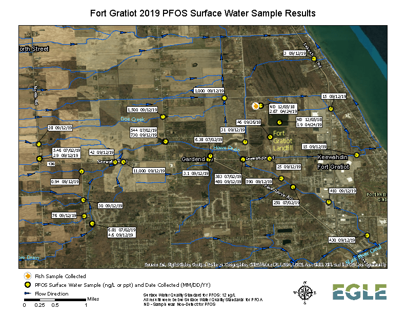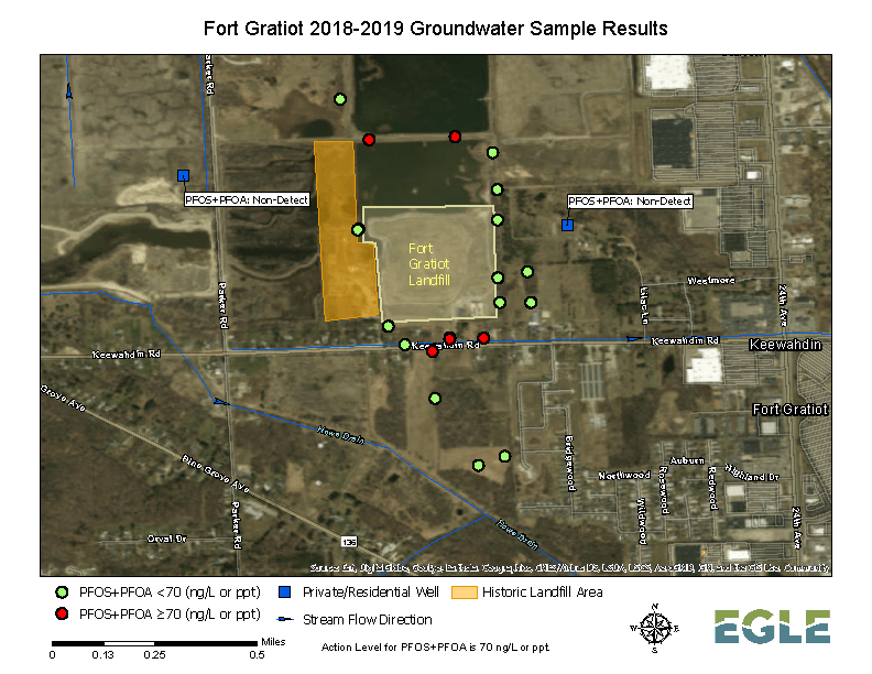 - Two drinking water wells near the Fort Gratiot Landfill (one residential well and one well at the St. Clair Drain Commission garage) were sampled for PFAS in November 2018 and April 2019. The results for both wells were non-detect for all PFAS tested.