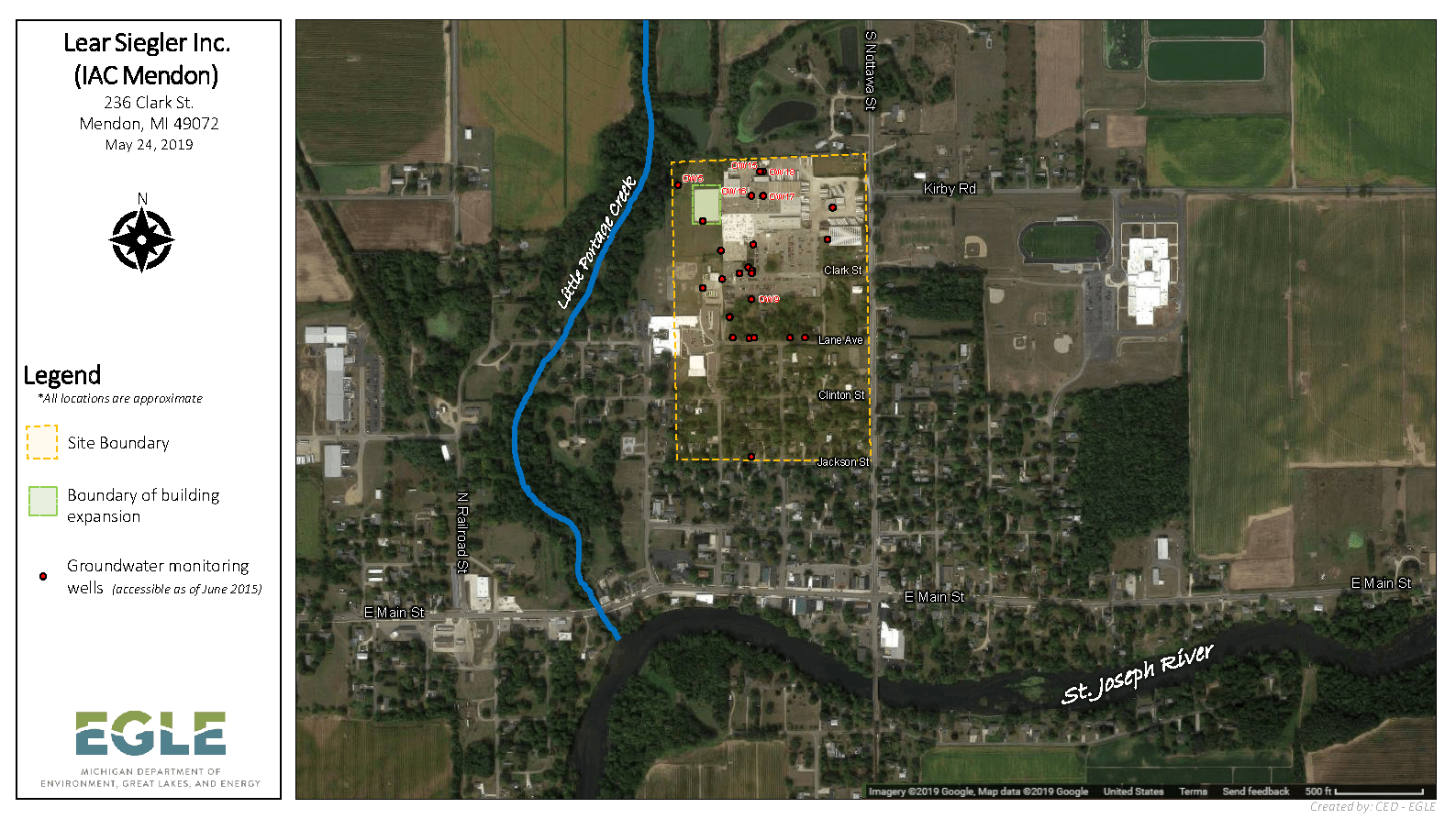 - On June 6, 2019, EGLE met with IAC Mendon to request they confirm the initial on-site groundwater results. EGLE also requested they sample additional on-site and downgradient off-site monitoring wells to help determine the extent of the contamination and whether it has migrated off-site. In addition, EGLE requested a survey of the area be conducted for potential undocumented private water wells.