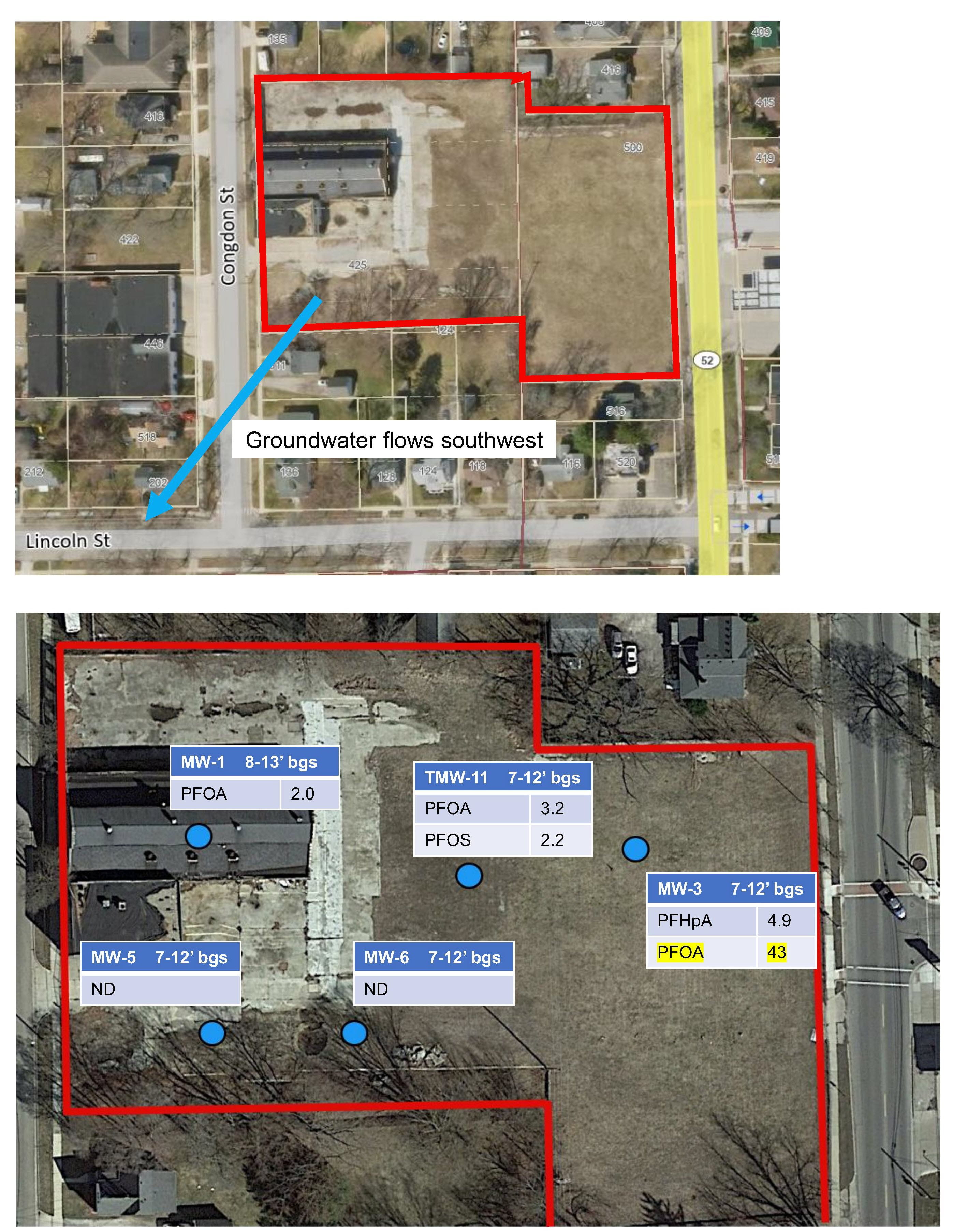 As part of their due diligence, in July 2023, their consultant sampled groundwater for PFAS. The highest groundwater result was 43 ppt PFOA (compared to 8 ppt). Groundwater flows generally to the southwest.