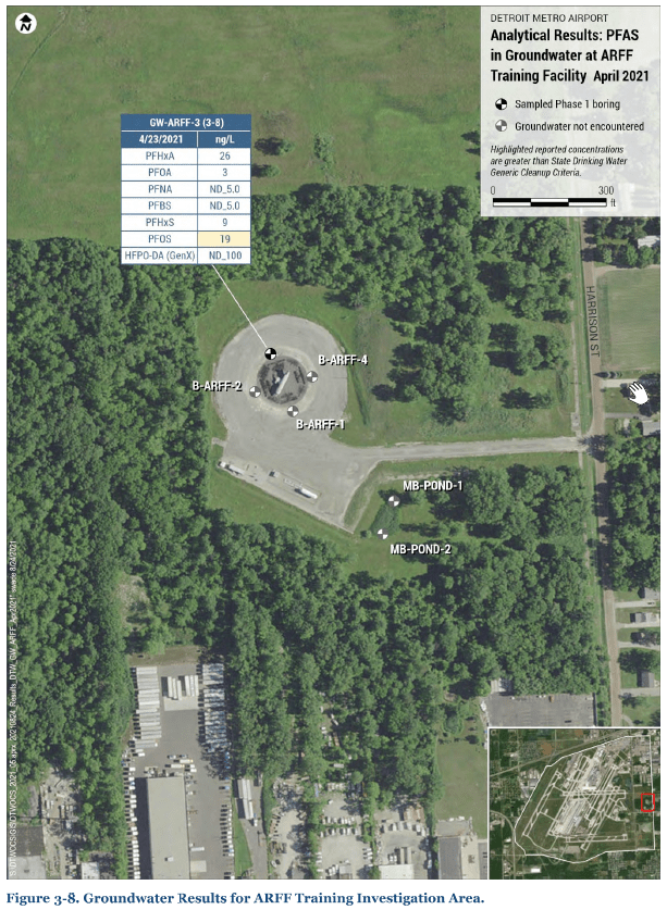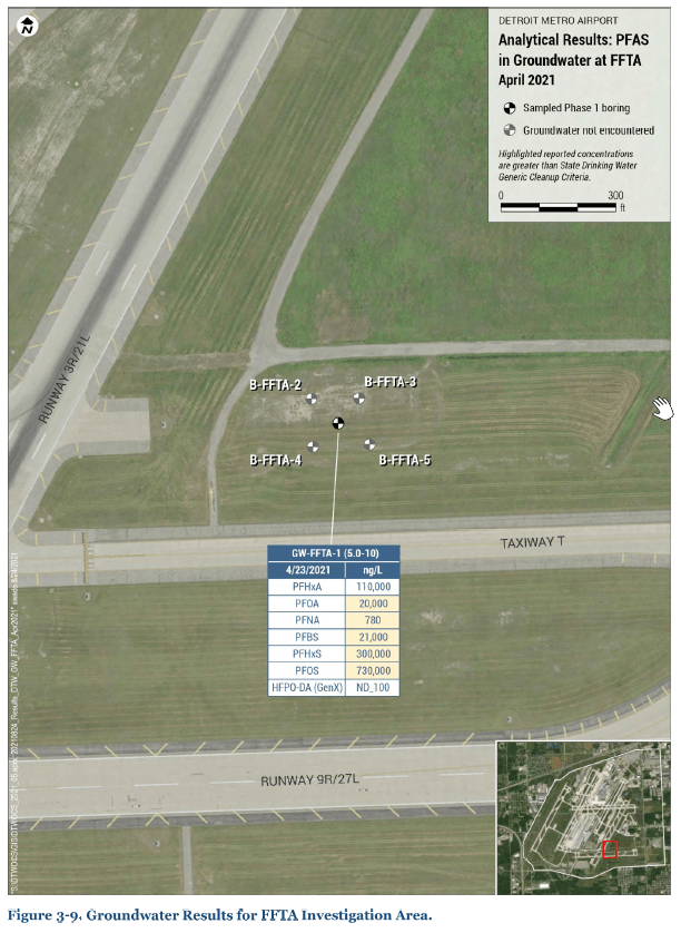 - On September 7, 2021, the airport's consultant submitted their first phase groundwater investigation report to EGLE. Three groundwater samples were collected during the first phase. The highest result was 730,000 ppt for PFOS.