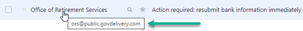 All emails we send show either ORS@public.govdelivery.com or ors-outreach@michigan.gov in the From address field. You may need to hover your mouse over the From field to see this address. The exact appearance will vary depending on your email system, but here are examples of an email header and an inbox list item: