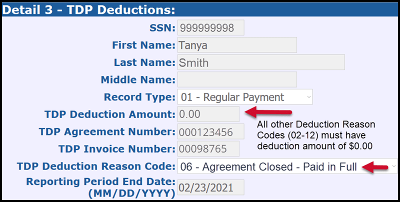- Records reporting a dollar amount in the TDP deduction amount field will always use the deduction code 01 - even if it's the final deduction or a TDP adjustment.