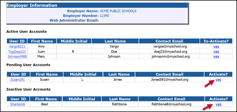 - To activate a new user account, find the name in the Pending User Accounts and click the yes link in the Activate? column.