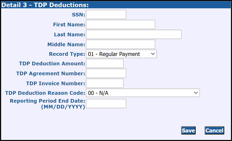 Detail 3 -TDP Deductions (DTL3) records report tax-deferred payment (TDP) deductions for your employees to ORS. Include them in your report upload to ORS with your other DTL records.
