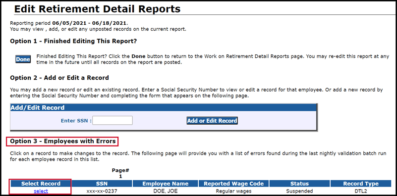 - Scroll down to Option 3 - Employees with Errors. Click the select link next to record to see error messages and to edit the record.