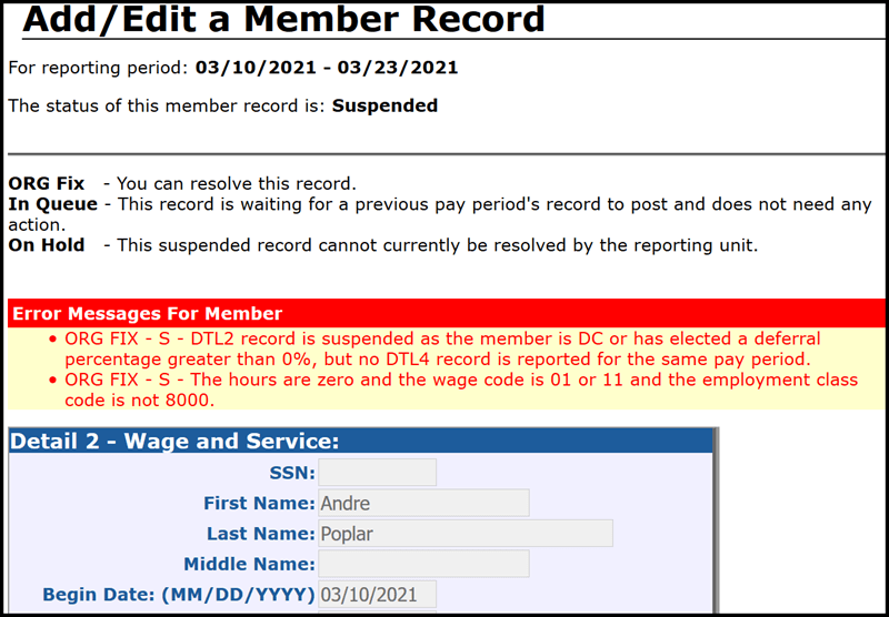 - The record will open and you can make corrections. NOTE: once the record is edited, it will no longer appear under the Employees with Errors section. To re-open the record, you will need to manually enter in the employee's SSN to see all detail records.