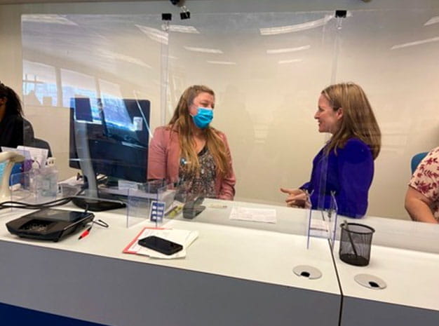 Secretary Benson talks with a team member at the Secretary of State office on East Michigan Avenue in Lansing.
