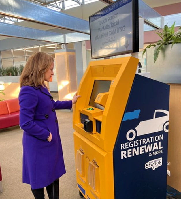 Secretary Benson inspects the self-service station at the Secretary of State office in Wyoming, Mich.