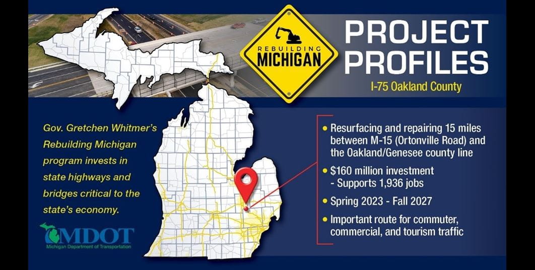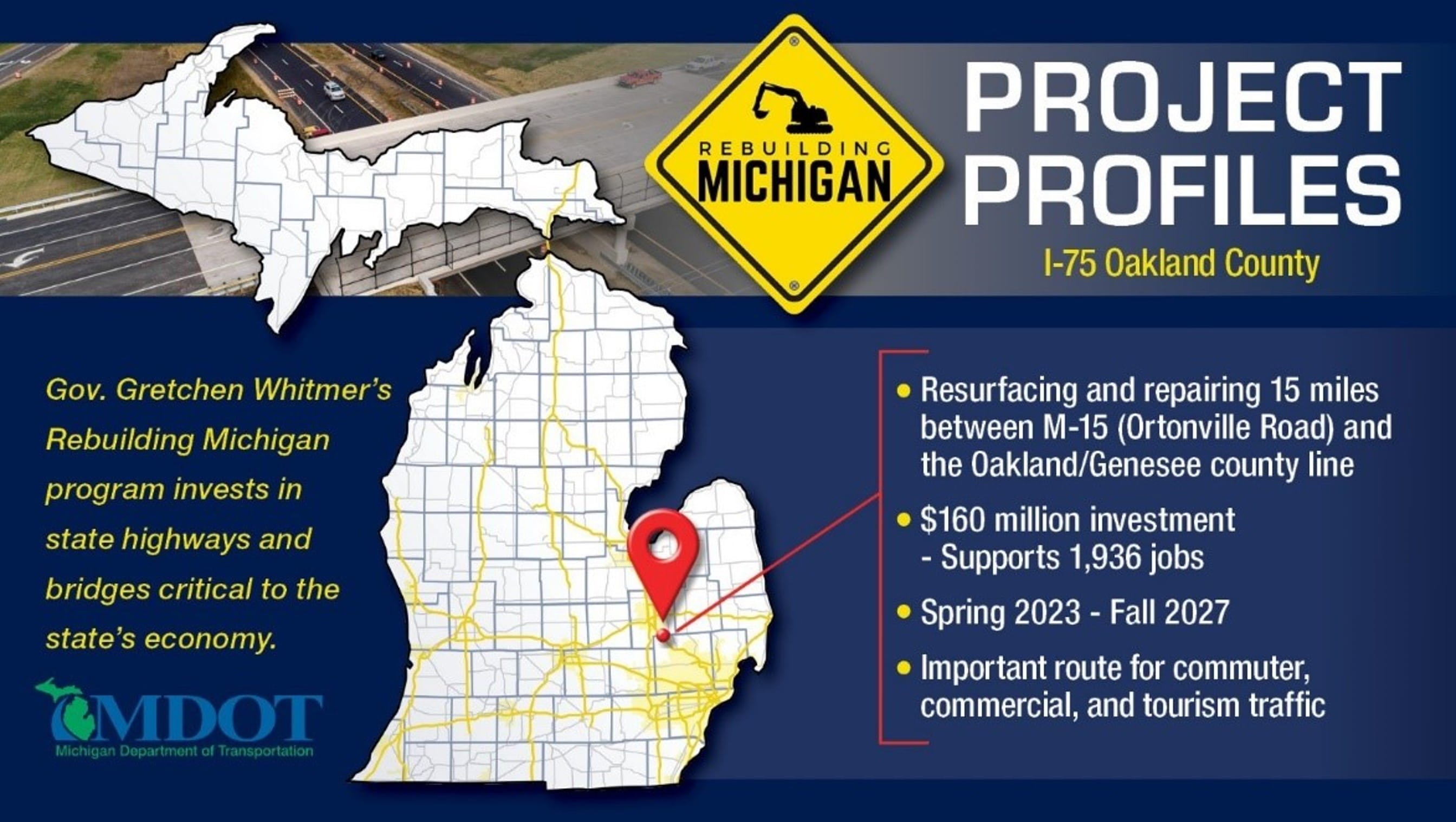 MDOT is investing approximately $160 million to resurface and repair I-75 from M-15 (Ortonville Road) to the Oakland/Genesee county line. This project includes resurfacing I-75, repairing 11 bridges, drainage improvements, culvert replacements, signs, and guardrail. Various work will be performed in different locations with different schedules throughout the 15 miles over four years. Based on economic modeling, this investment is expected to support 1,936 jobs.